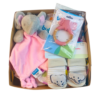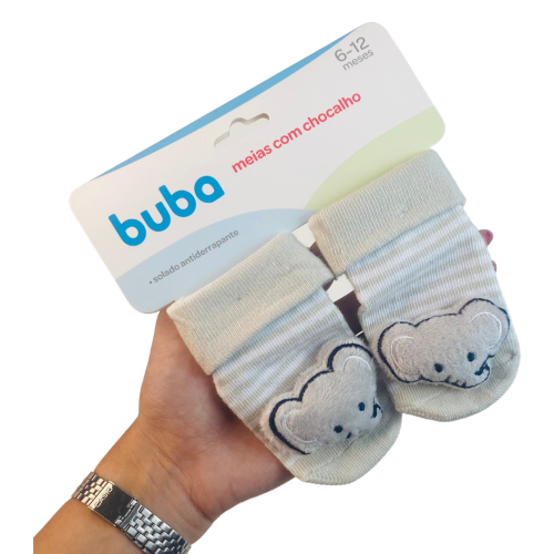 Por último, incluímos uma meia com chocalho. Os chocalhos produzidos são suaves quando o bebê move os pés, o que pode ajudar no desenvolvimento da audição e na compreensão da causa e efeito.