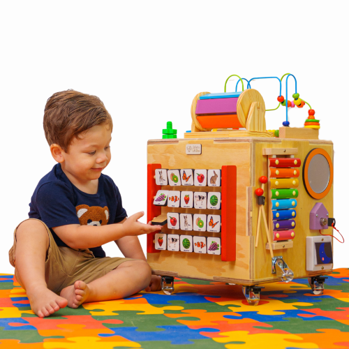 Nosso Cubo Sensorial de Atividades Educativas é uma peça feita à mão, com lixamento minucioso e acabamento em verniz à base d’água, pensado para unir desenvolvimento e diversão de forma lúdica, segura e durável.