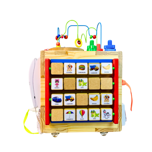 O cubo conta com 18 atividades interativas educativas, com estímulos visuais, táteis e sonoros que incentivam o aprendizado e a curiosidade das crianças.