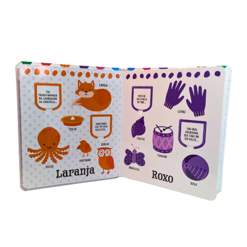 - Este livro, parte da coleção “Abra e descubra”, oferece uma experiência sensorial e educativa. Com almofadado médio, encadernação de lombada quadrada e acabamento em laminação brilho, é especialmente desenhado para crianças de 0 a 3 anos, proporcionando aprendizado através de cores e conceitos de forma interativa.