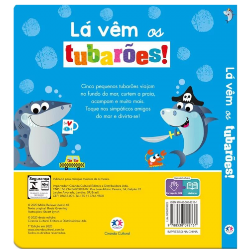 Acompanhe a emocionante jornada dos cinco pequenos tubarões enquanto exploram o fundo do mar, curtem a praia, acampam e muito mais. Este livro interativo, parte da coleção “Lá Vêm os…” da editora Ciranda Cultural, é uma edição de 2020, perfeito para crianças a partir de 4 anos.