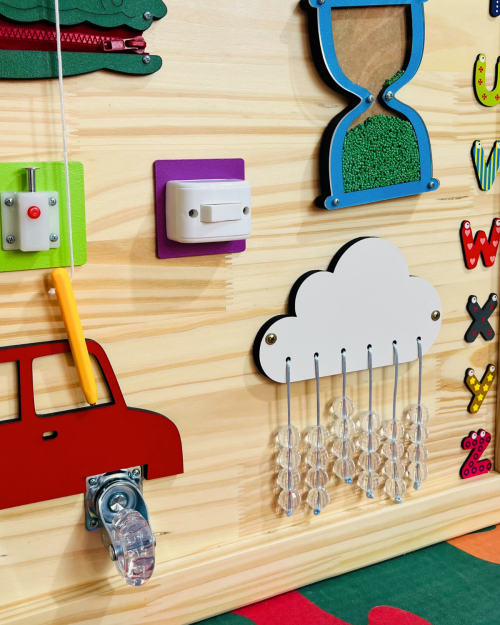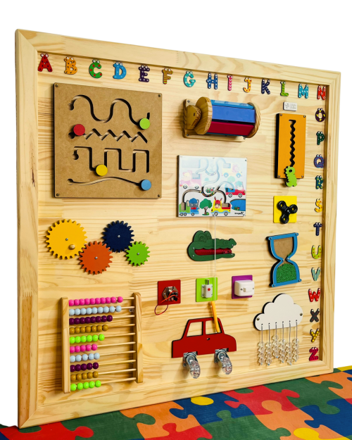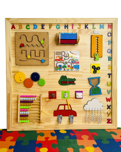 O Mural Lúdico é um painel sensorial completo com 15 atividades fixas que estimulam a coordenação motora, o raciocínio lógico e a curiosidade infantil. Produzido artesanalmente em madeira pinus com 15mm de espessura e acabamento moldurado, ele mede 1 metro de largura por 1 metro de altura. Um recurso perfeito para clínicas, escolas, espaços Montessori e salas sensoriais.