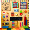 Alfabeto, Tambor giratório, Calculadora, Caça palavras giratório, Carrinho com rodinhas, Dominó, Jogo das cores, Passa cadarço simples, Zigue Zague Dino, Painel psicomotor com linhas vazadas, Teclado, Aramado pequeno, Espelho (Acrílico), Roleta de cores, Tomada com plug, Telefone, Ábaco de madeira, Nuvem puxa puxa, Jogo da velha giratório.