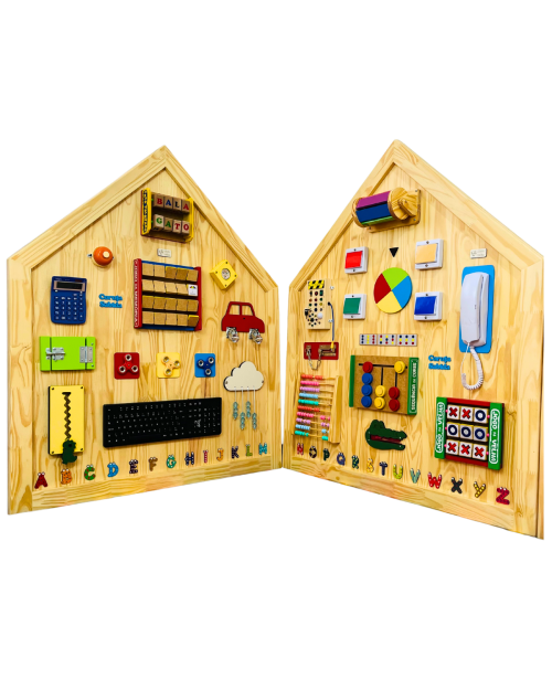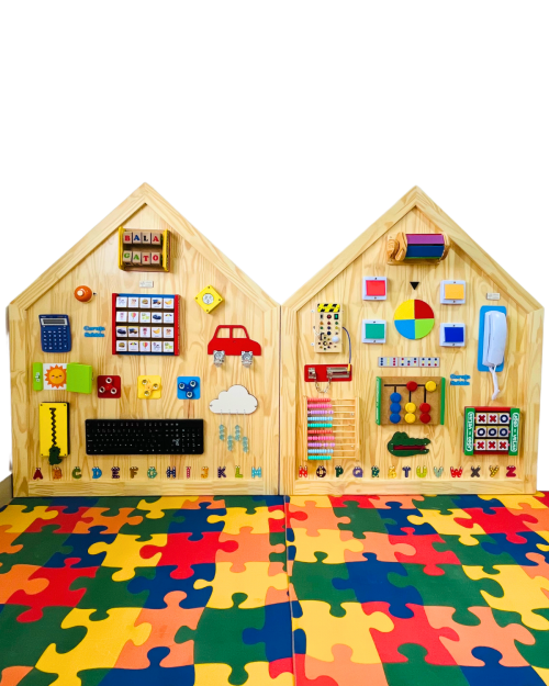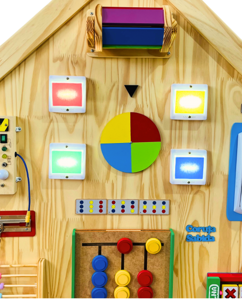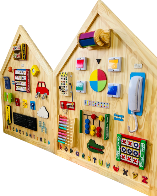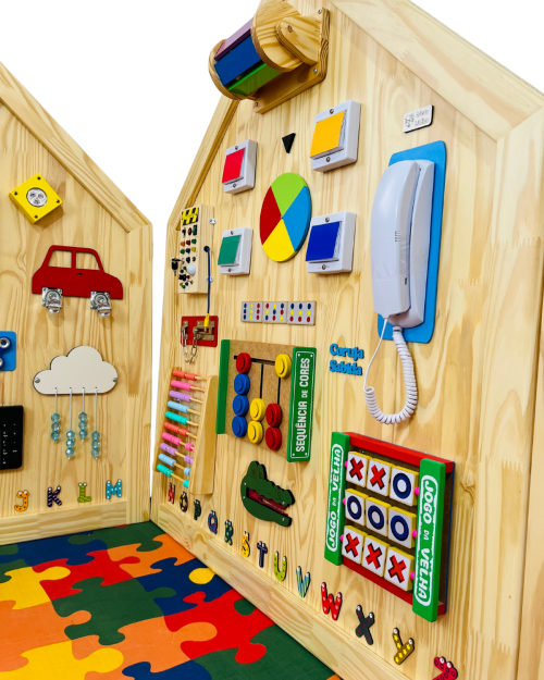 O Painel de Atividades Educativas Modelo Casinha Encanto foi desenvolvido para estimular o desenvolvimento motor, sensorial e cognitivo das crianças de forma lúdica e interativa.