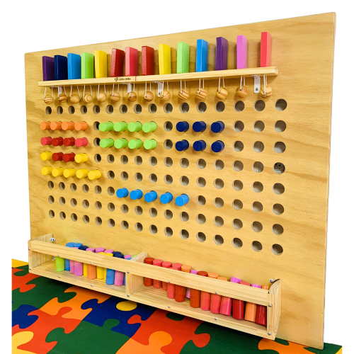 Ideal para escolas, clínicas e espaços sensoriais, esse painel favorece a coordenação motora fina, a percepção visual e o reconhecimento de cores, por meio de atividades práticas e intuitivas.