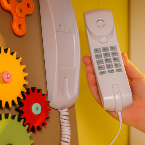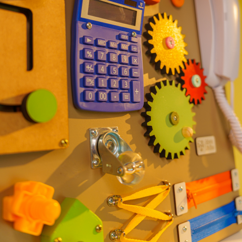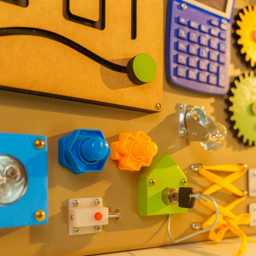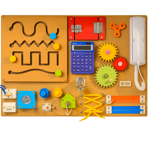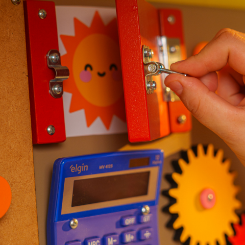 Painel psicomotor com linhas vazadas, Fechadura de pressão, Portinha com tranca, Spinner, Telefone, Engrenagem de madeira, Calculadora, Tomada com plug, Caixinha de luz LED, Parafuso com porca, Interruptor, Passa cadarço simples, Zíper simples.