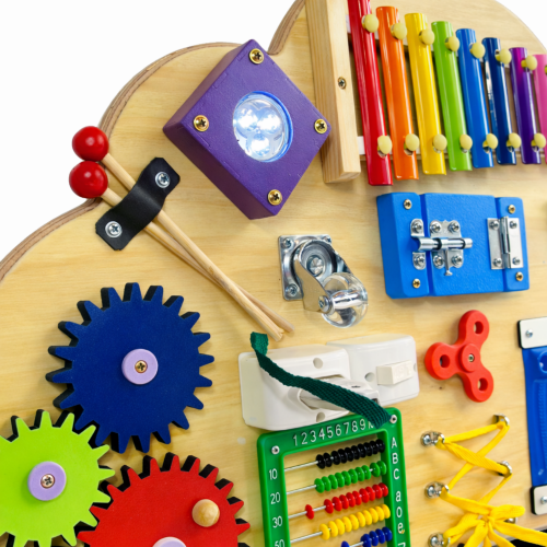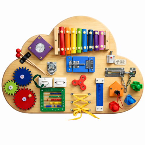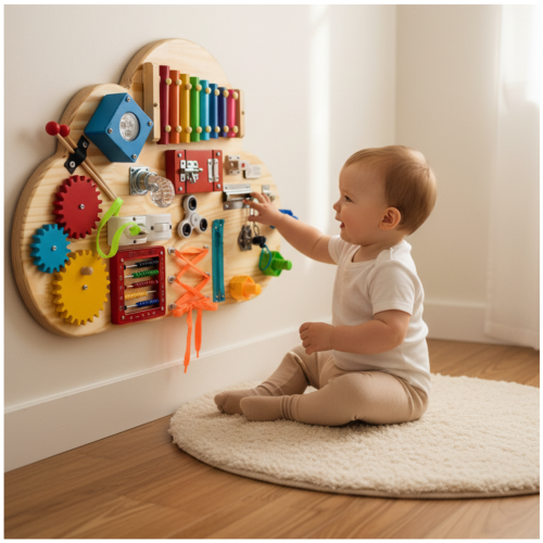 Painel Sensorial Montessori em Madeira – Modelo Nuvem