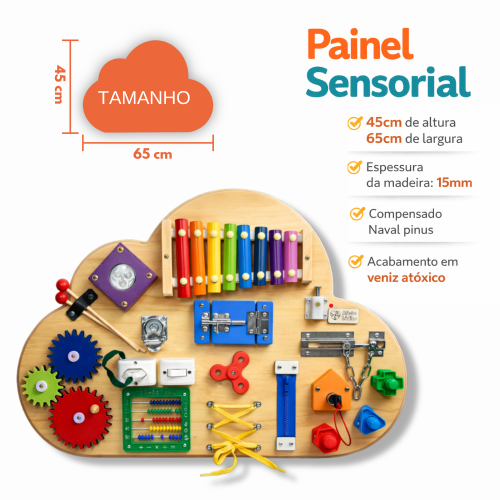 Este painel sensorial foi pensado para promover o desenvolvimento cognitivo, motor e afetivo de forma segura, lúdica e criativa.
