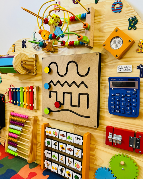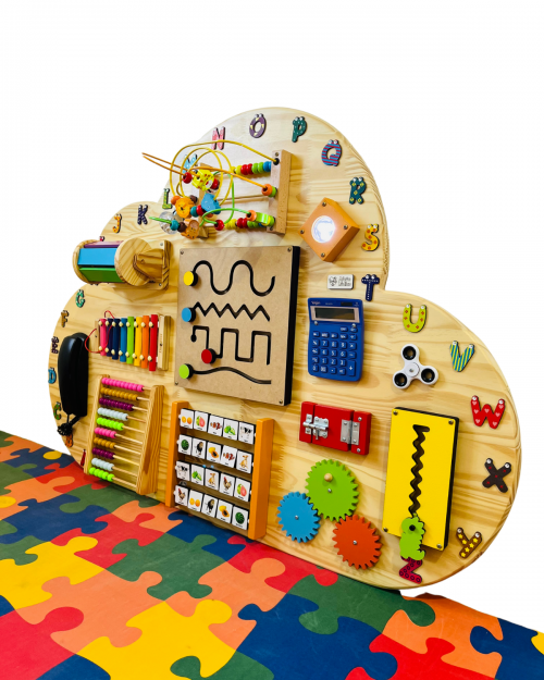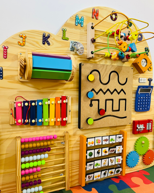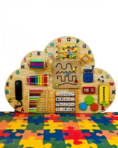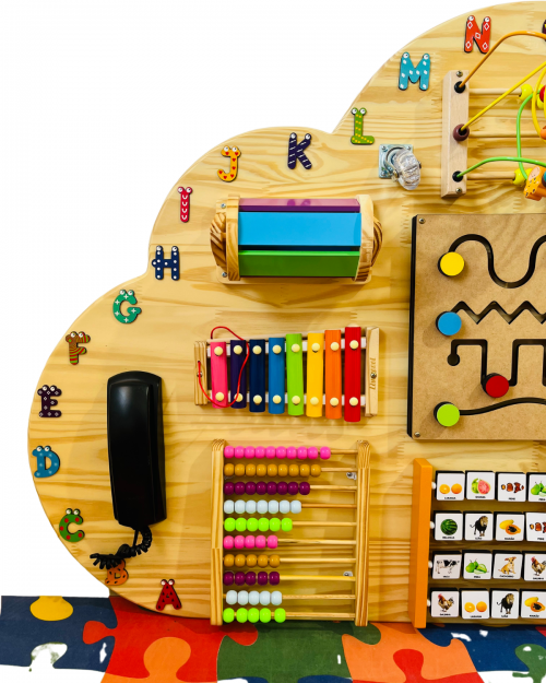 O Painel Sensorial Nuvem Gigante da Afeto Lúdico é uma estrutura em madeira pinus maciça com design encantador e acabamento artesanal. Com 120cm de altura e 83cm de largura, ele reúne múltiplas atividades sensoriais e motoras que desenvolvem habilidades cognitivas, afetivas e psicomotoras nas crianças. Ideal para clínicas, escolas, brinquedotecas e espaços de leitura ou espera.