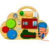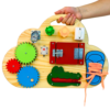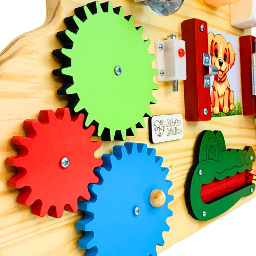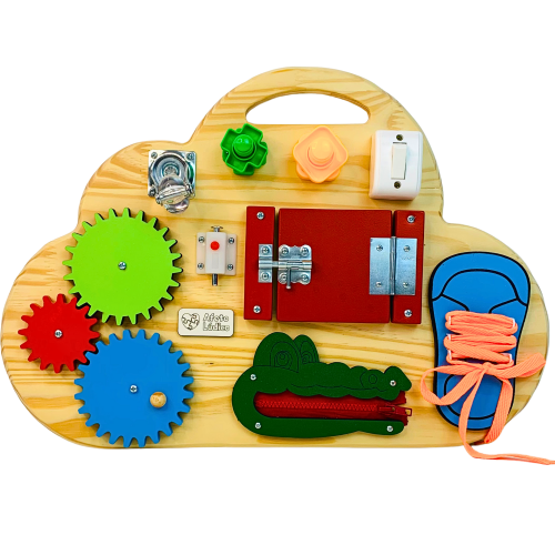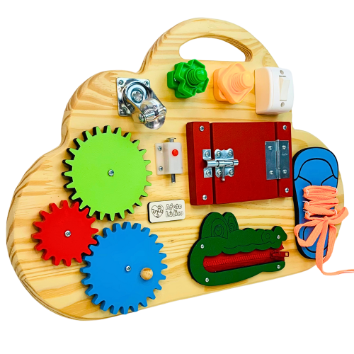 Com design lúdico em formato de nuvem, este painel oferece 8 atividades fixas que promovem o desenvolvimento motor, sensorial e cognitivo de forma divertida e segura.