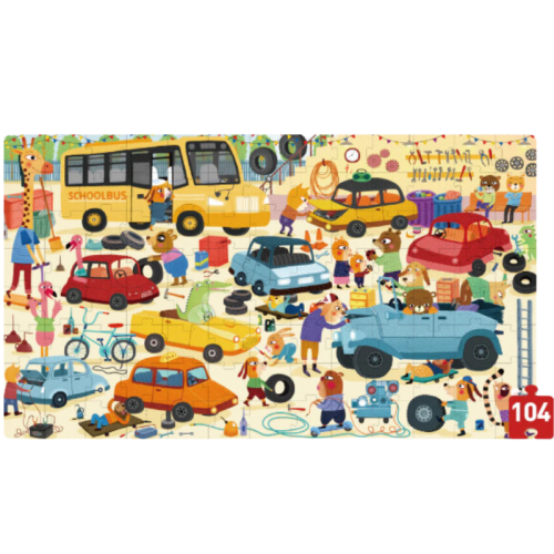 -Com 104 peças, este quebra-cabeça retrata uma animada oficina mecânica onde animais consertam veículos.